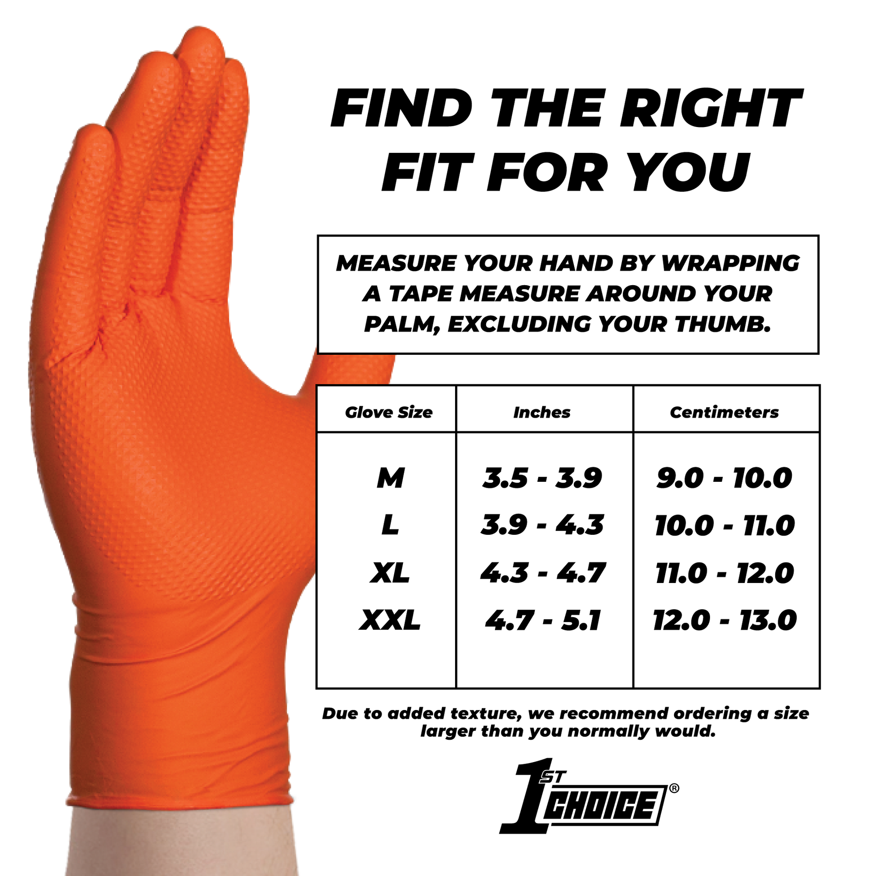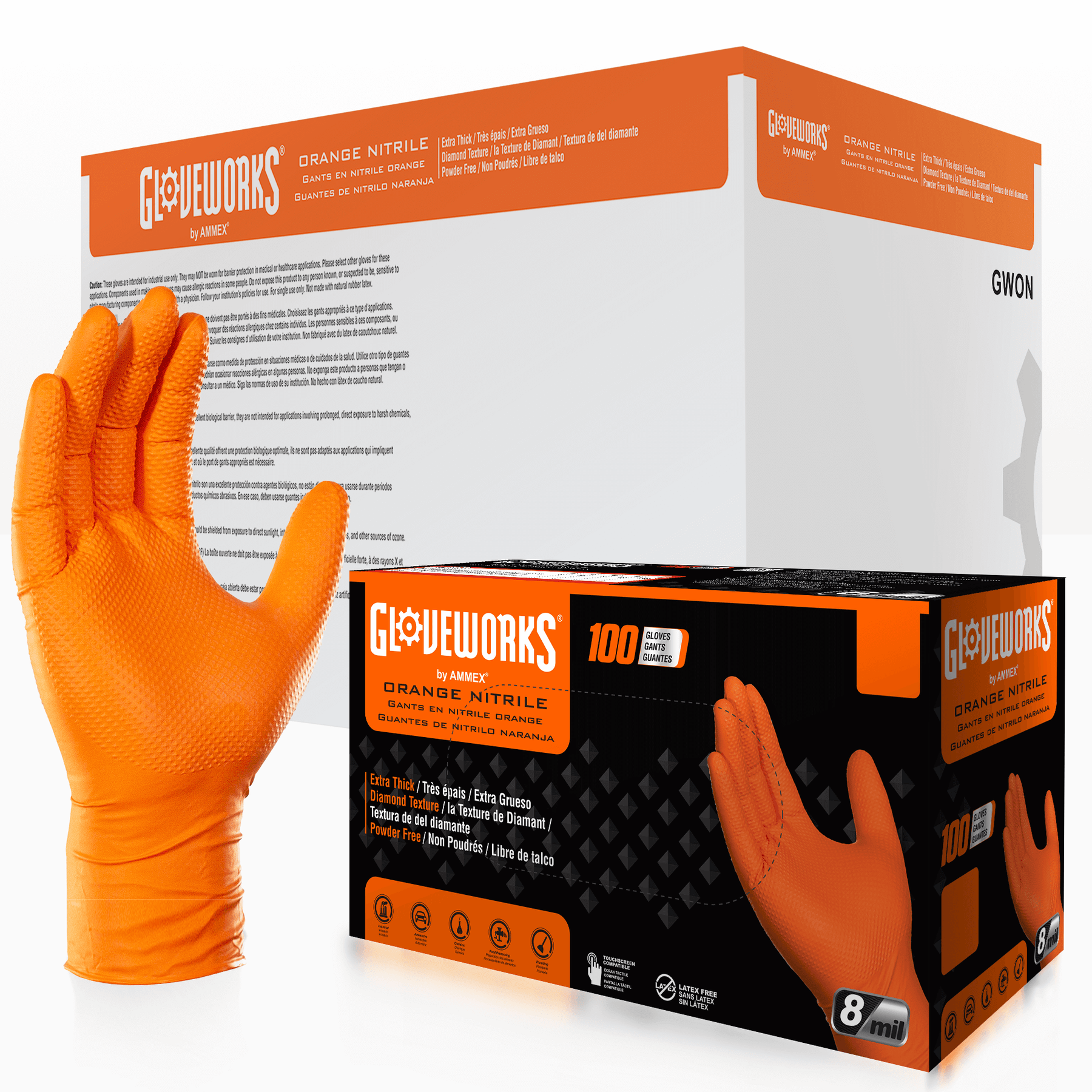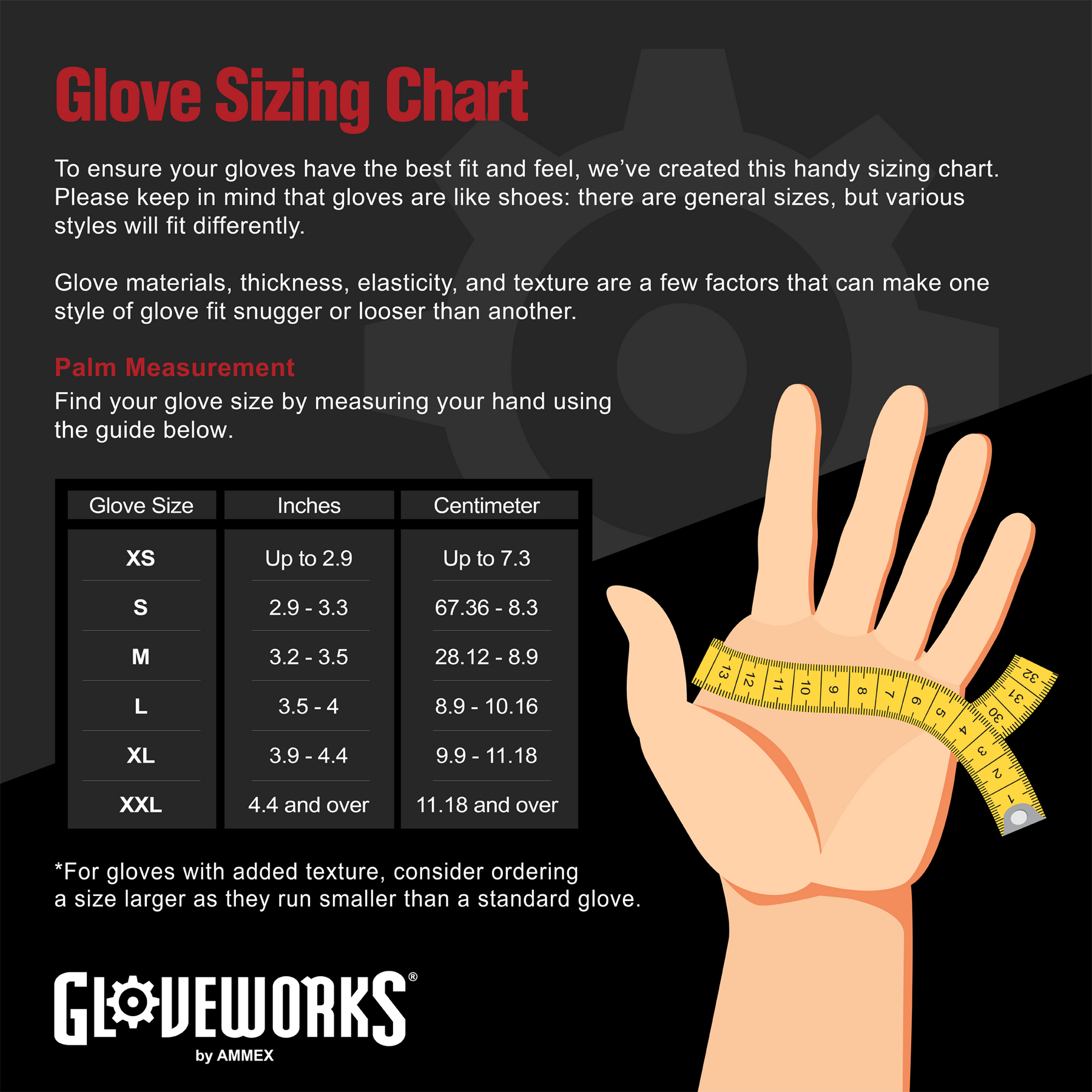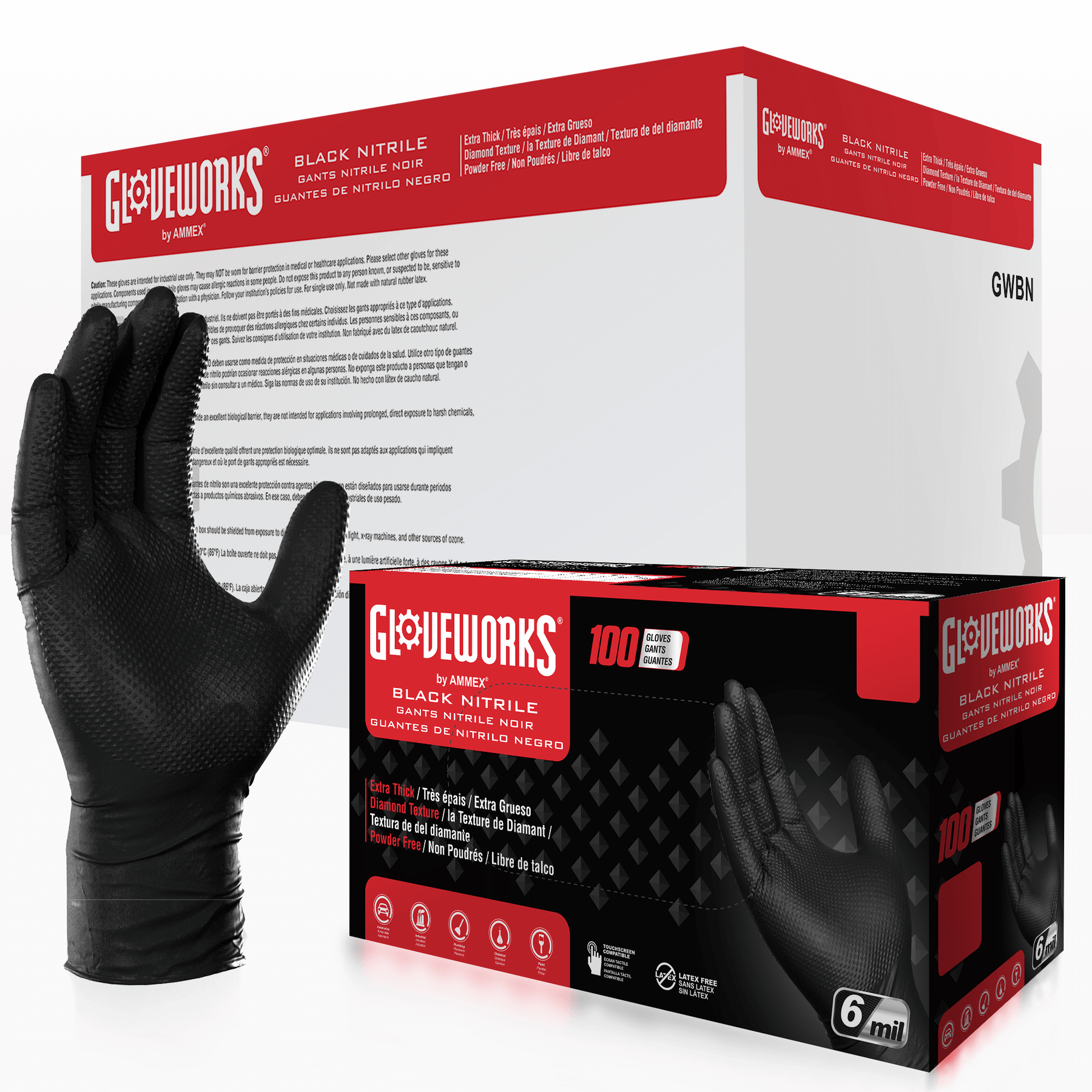 Gloveworks HD Textured Black Nitrile Industrial Gloves deliver strength, dexterity, durability, fit, feel, and comfort. Comprised from thick 6-mil nitrile, they also feature raised diamond texture, with 60 percent more surface area than standard nitrile gloves. The diamonds channel away liquids for first-rate gripping power in wet conditions. Nitrile is durable and more resistant to punctures, tears, and rips. It protects against grease, pesticides, gasoline, and specialty chemicals. They are touchscreen compatible and feature excellent tactile sensitivity making them a great fit for applications from automotive to manufacturing, janitorial to plumbing, paint shop to food service. Food-safe and commonly bought for countless uses around the home. Black color helps conceal grime. Latex-free and powder-free. Buy one size larger than you normally would.