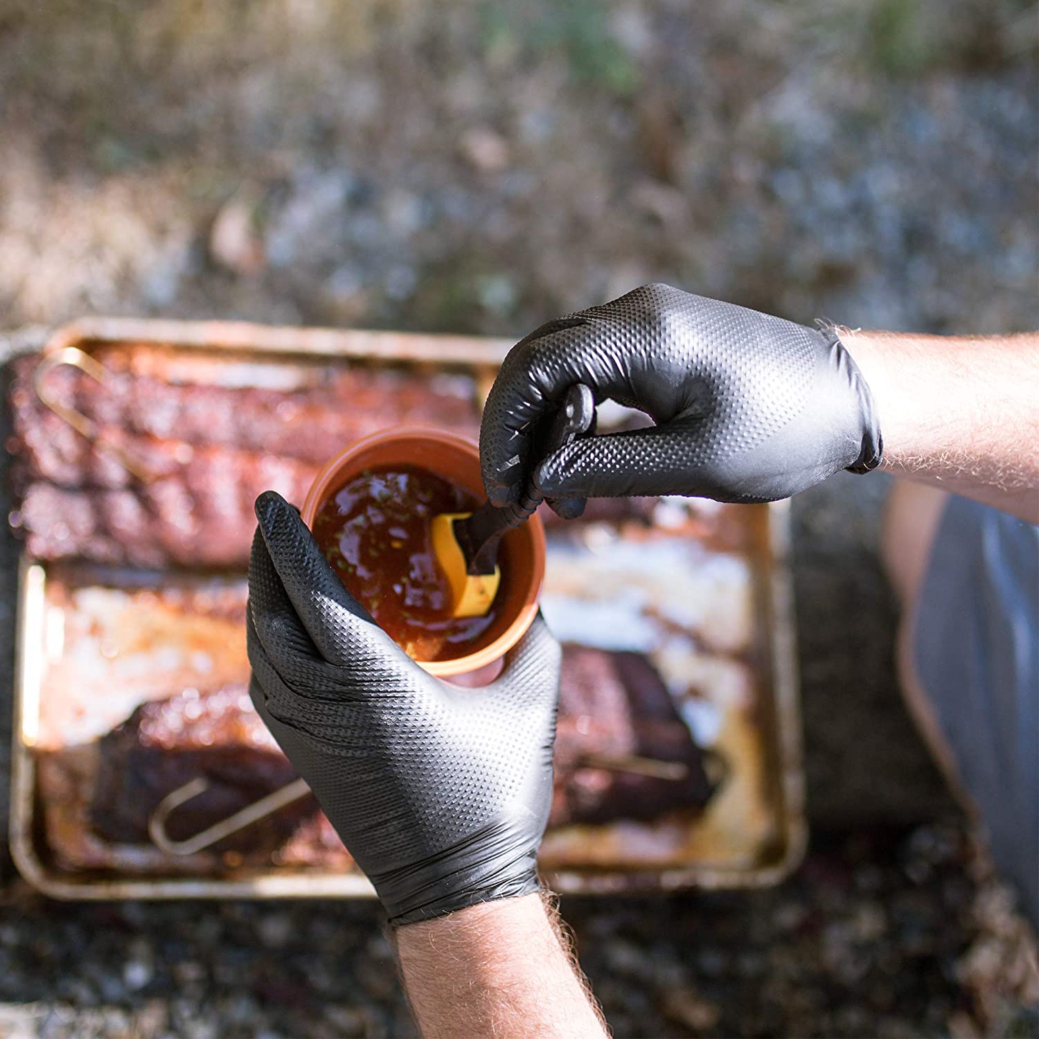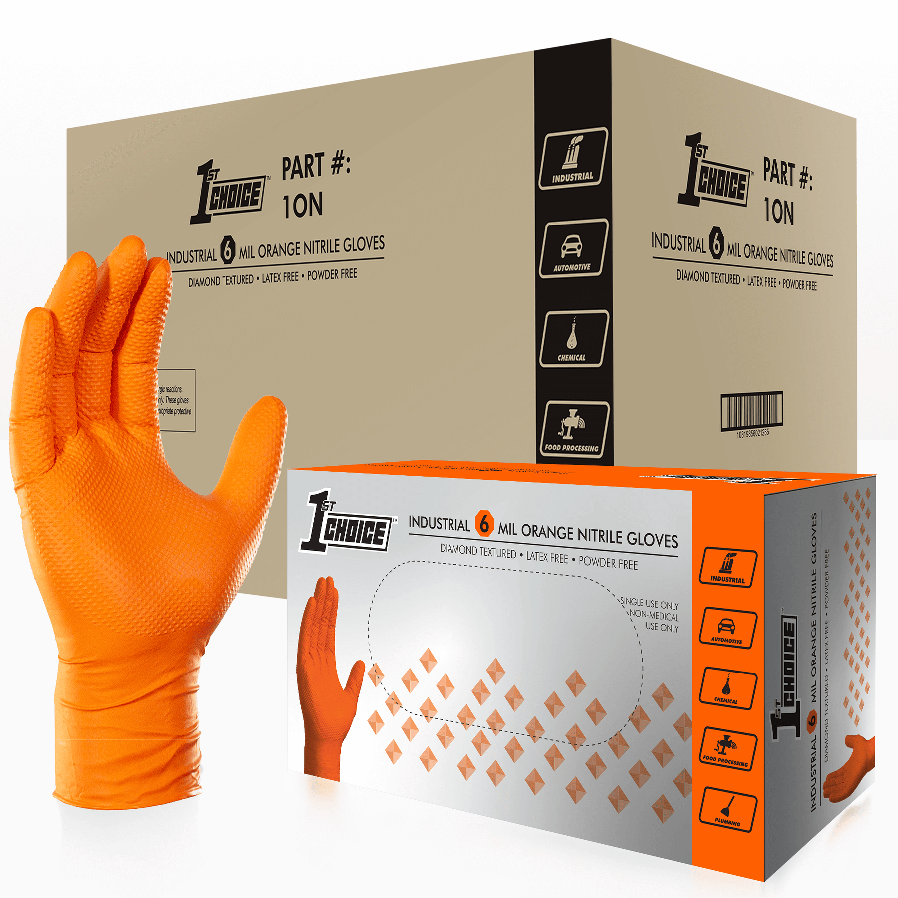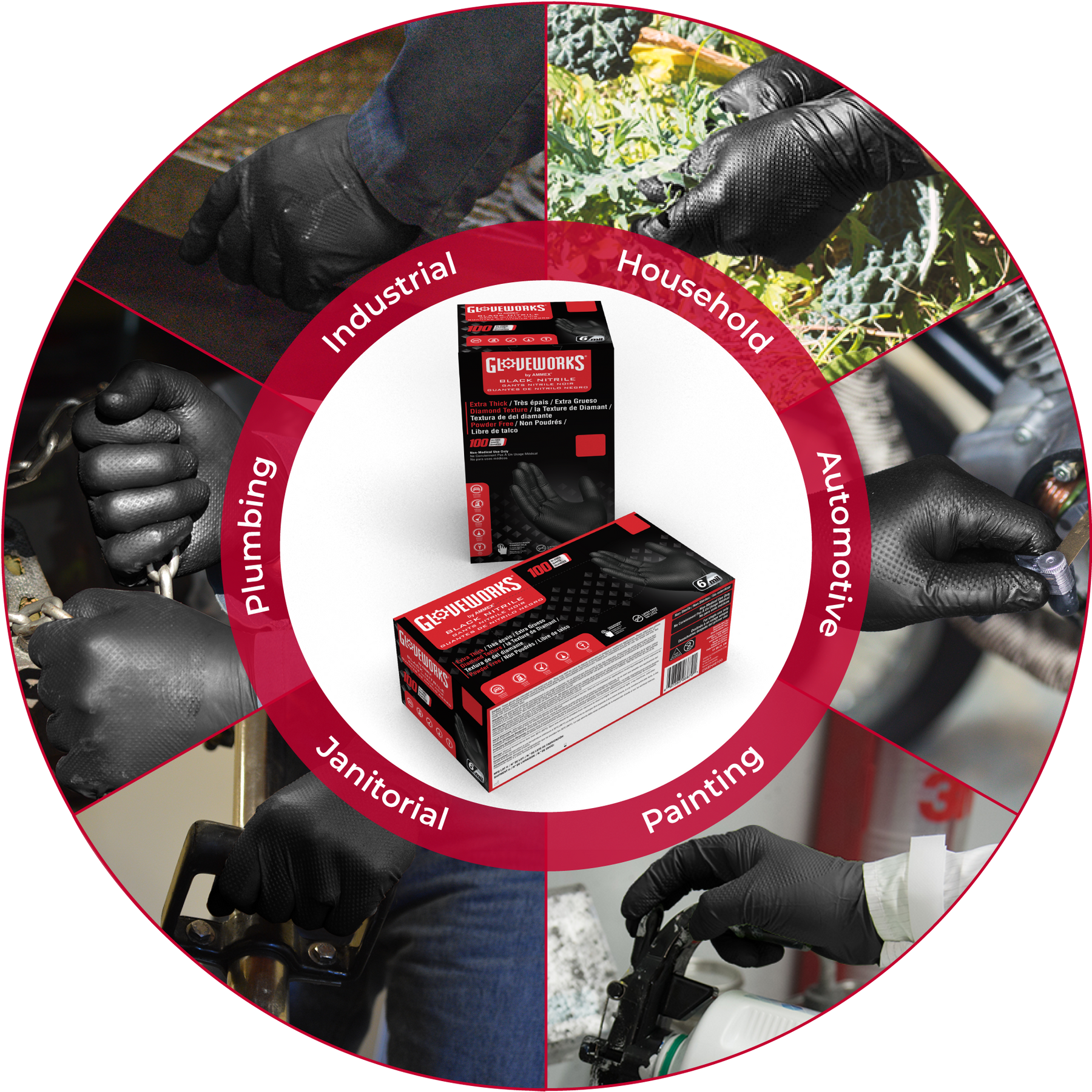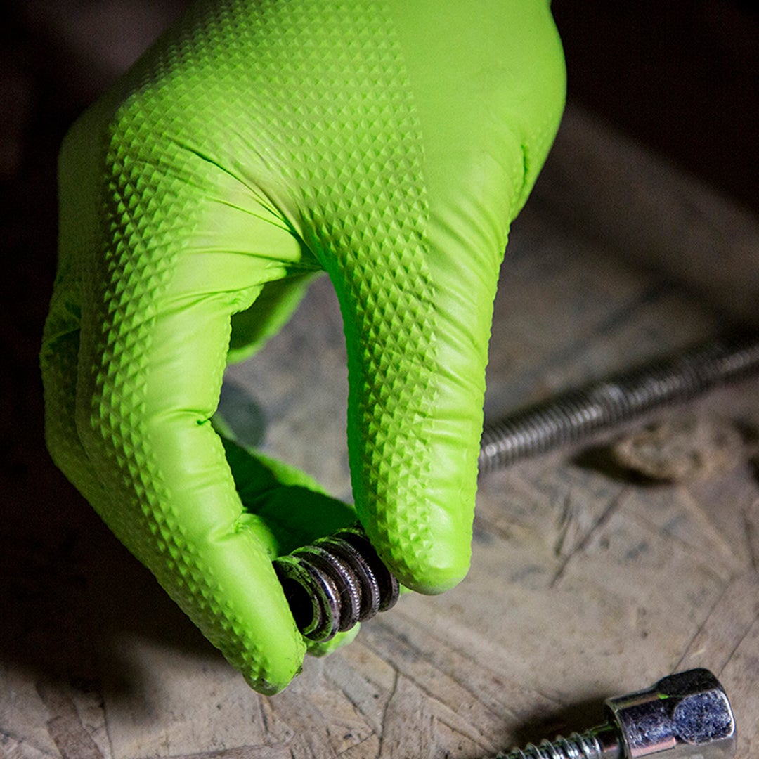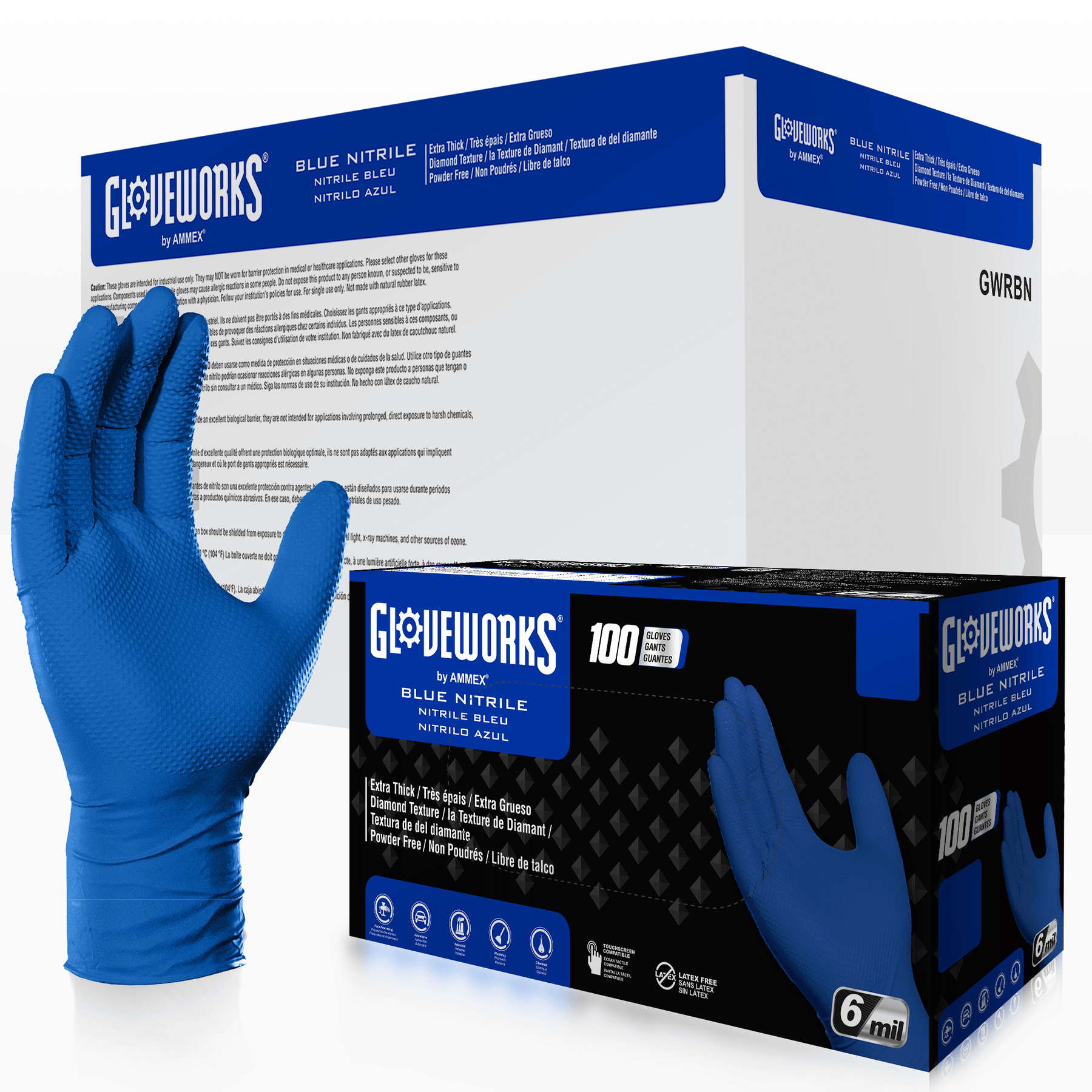 Gloveworks HD Textured Black Nitrile Industrial Gloves deliver strength, dexterity, durability, fit, feel, and comfort. Comprised from thick 6-mil nitrile, they also feature raised diamond texture, with 60 percent more surface area than standard nitrile gloves. The diamonds channel away liquids for first-rate gripping power in wet conditions. Nitrile is durable and more resistant to punctures, tears, and rips. It protects against grease, pesticides, gasoline, and specialty chemicals. They are touchscreen compatible and feature excellent tactile sensitivity making them a great fit for applications from automotive to manufacturing, janitorial to plumbing, paint shop to food service. Food-safe and commonly bought for countless uses around the home. Black color helps conceal grime. Latex-free and powder-free. Buy one size larger than you normally would.